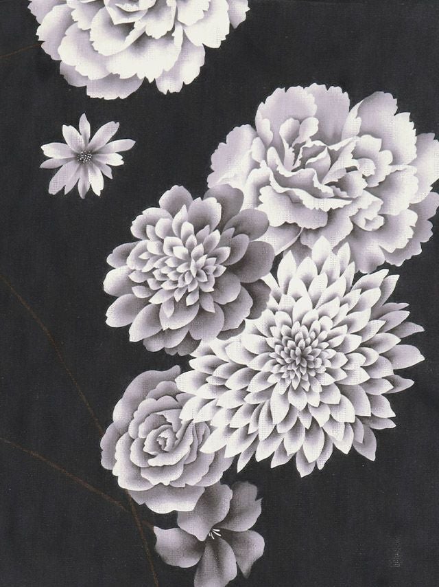 妖艶 黒地 グレー 白 花 ゆかた3点セットの生地アップ画像