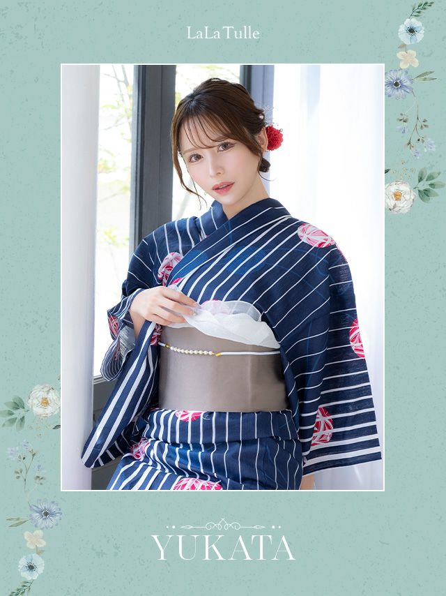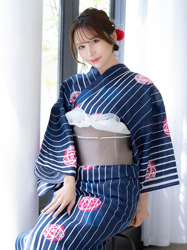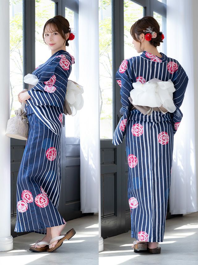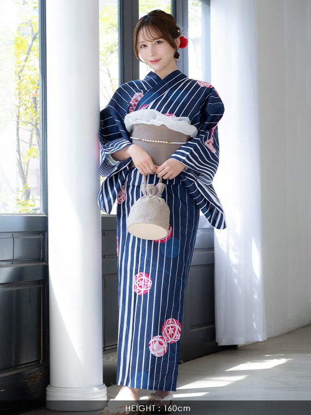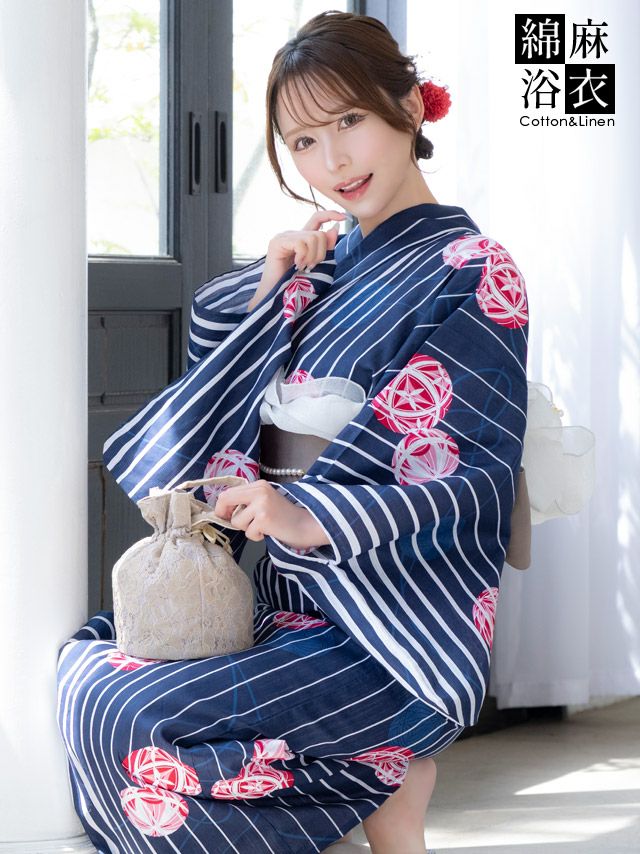 5. SALE [浴衣 選べる帯] 綿麻 紺地に白ストライプ 鞠デザイン 大人綺麗 3点セット 伊藤舞雪着用 (ゆかた・平帯or作り帯・下駄)