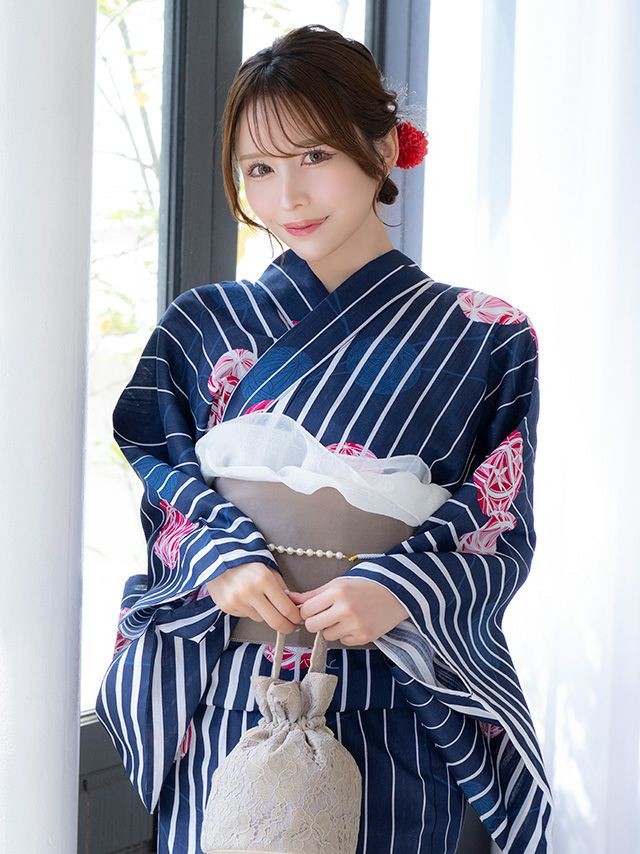 3. SALE [浴衣 選べる帯] 綿麻 紺地に白ストライプ 鞠デザイン 大人綺麗 3点セット 伊藤舞雪着用 (ゆかた・平帯or作り帯・下駄)
