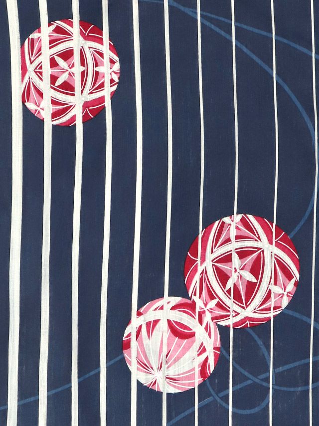綿麻 紺地に白ストライプ 鞠デザイン ゆかた3点セットの生地アップ画像