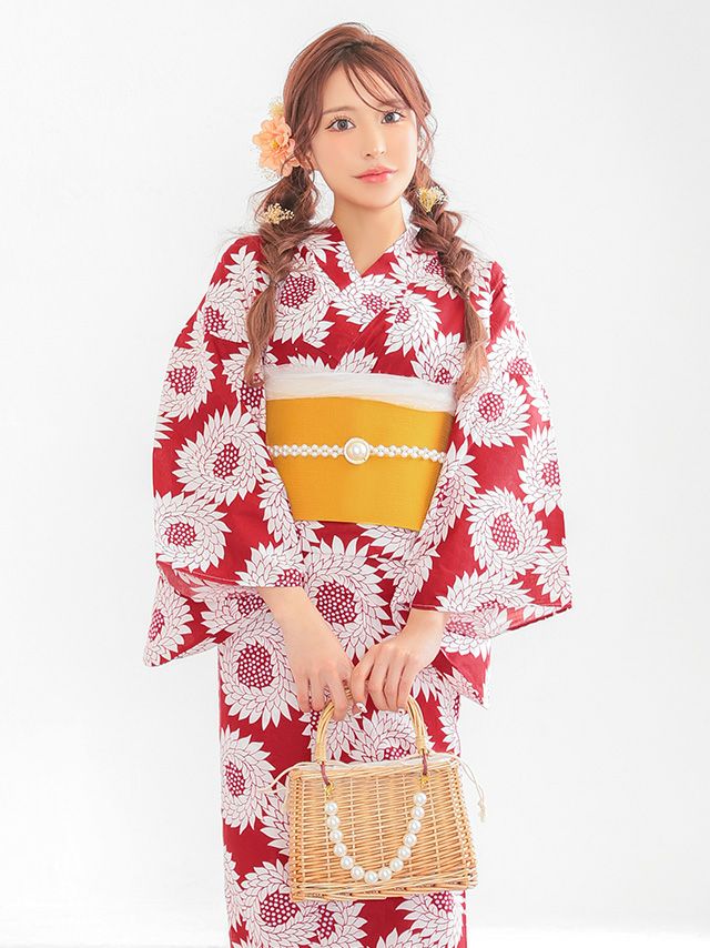 プチプラ 赤地 × レトロ 向日葵柄 ゆかた 3点セットの全身フロント画像