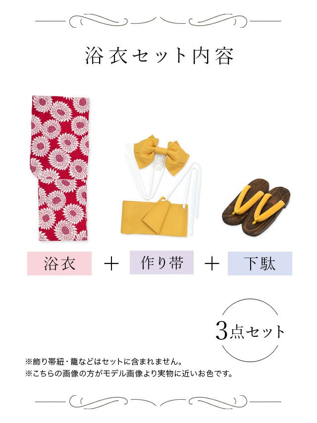 プチプラ 赤地 × レトロ 向日葵柄 ゆかた 3点セットのセット内容
