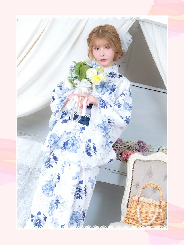 ワンピース 白地 水彩 ニュアンスフラワー ゆかた3点セットのイメージ画像1