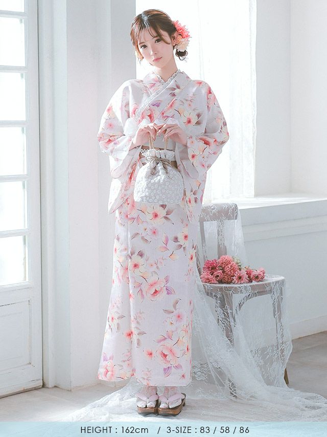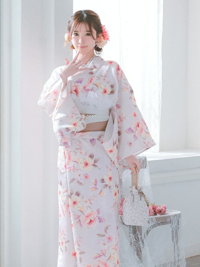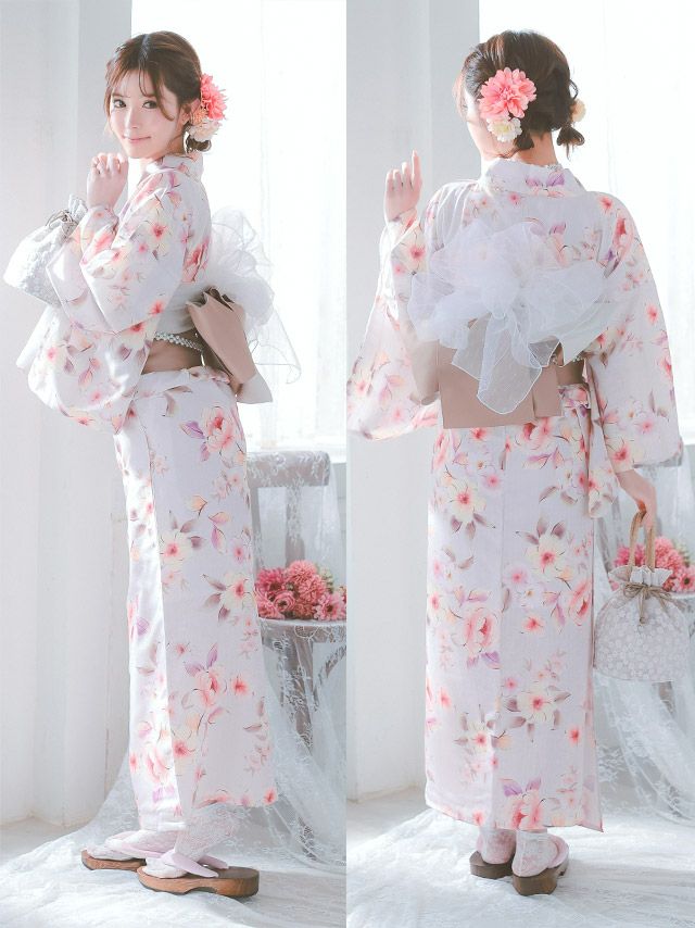 4. [浴衣 選べる帯] ピンクニュアンス水彩フラワー 2025 SWEETシリーズ 3点セット (ゆかた・平帯or作り帯・下駄)