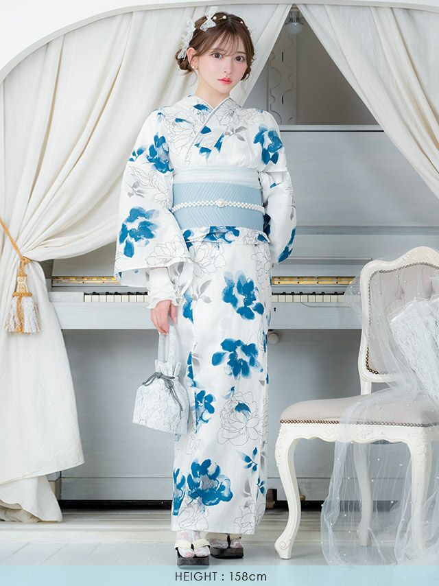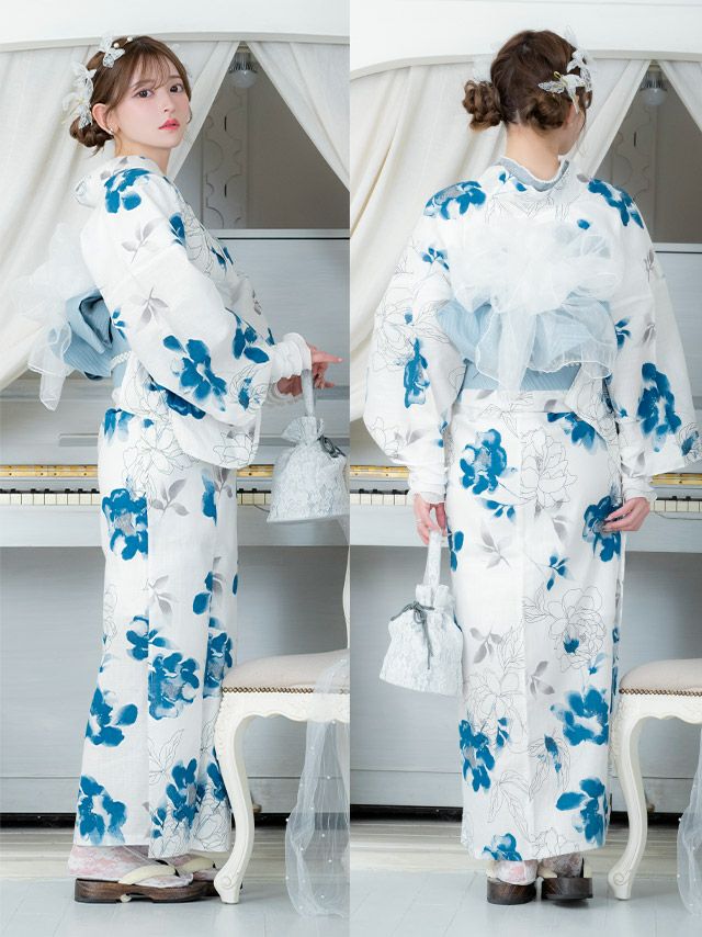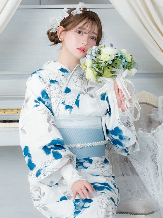 クラシカルかつ爽やかな甘さを演出♪ [浴衣] 水彩フラワー 白地 線画 2025 SWEETシリーズ 黒崎みさ着用 2点セット (ゆかた・平帯)