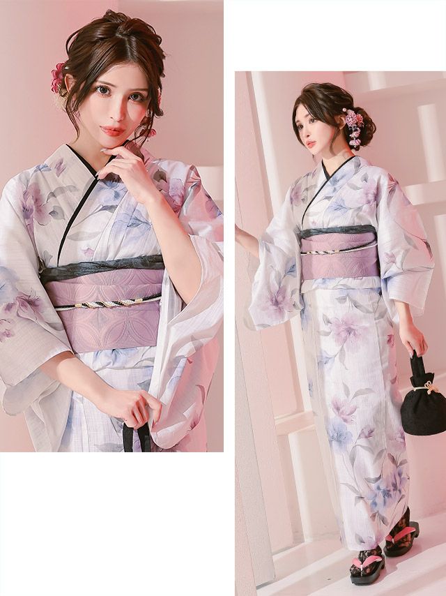 妖艶 白地×2色水彩フラワー ゆかた3点セットのイメージ画像1