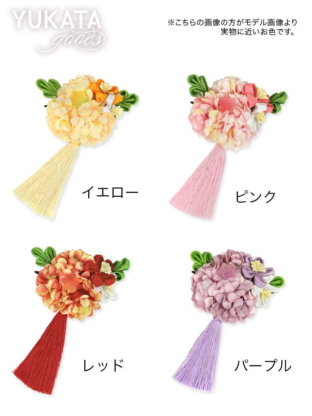 3. [浴衣小物] 髪飾り 紫陽花コサージュ×つまみ細工タッセルクリップ浴衣ヘアアクセサリー (ピンク/イエロー/パープル/レッド)