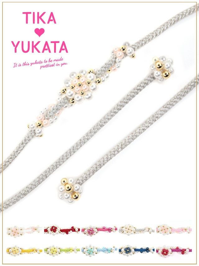4. [浴衣小物] 花形パールビース飾り帯紐 10色展開 (ホワイト/イエロー/イエローグリーン/ライトブルー/ブルー/パープル/レッド/ピンク/ライトピンク/シルバー)