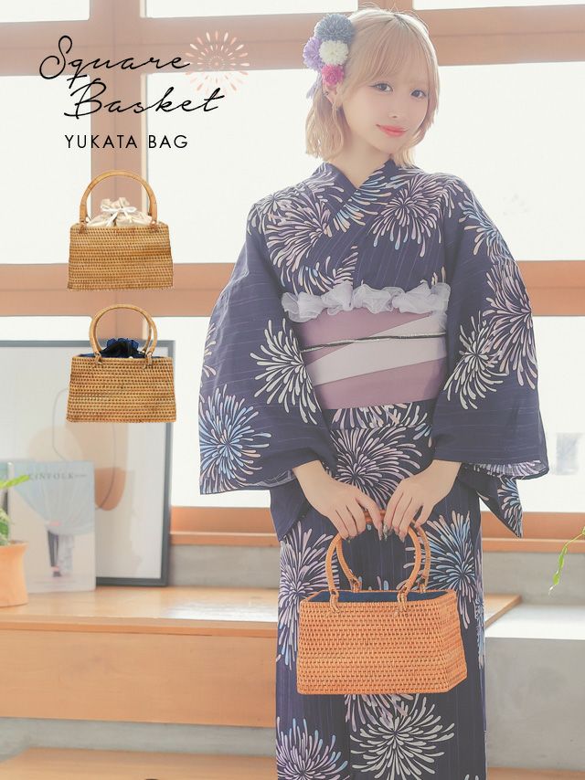 浴衣姿のワンポイントに♪ [浴衣小物] 巾着付きスクエアシンプルミニかごバッグ