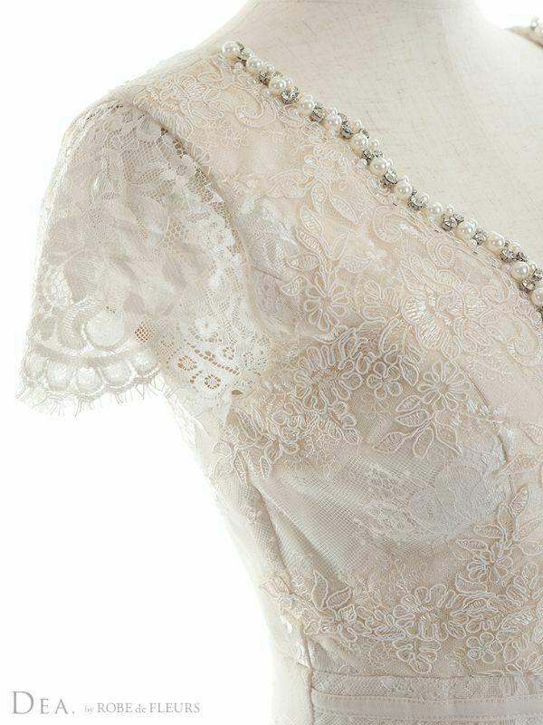 上品なデザインながら、バストを強調☆ [DEA.byROBEdeFLEURS/ディアバイローブドフルール] 高級半袖レースビジューウエストベルト切り替え膝丈タイトドレス