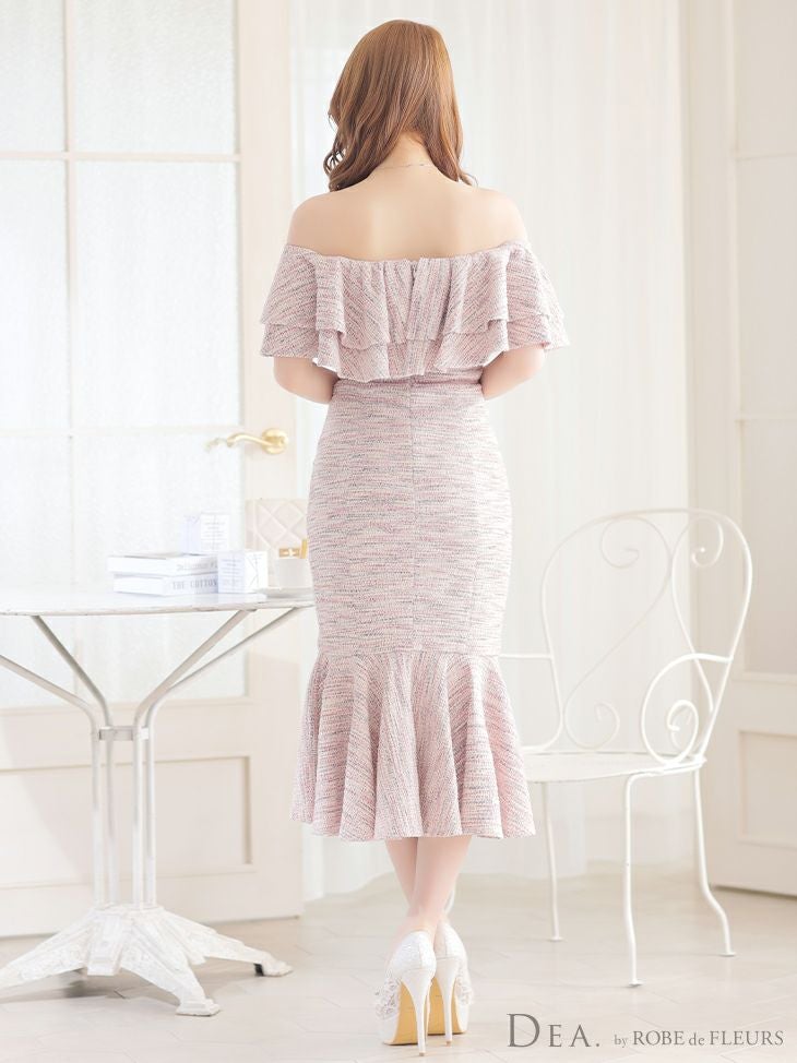 ガーリーにもセクシーに着こなせる☆ [DEA.byROBEdeFLEURS/ディアバイローブドフルール] 高級オフショルダー胸元フリルツイードアシメマーメイドタイト膝丈ドレス