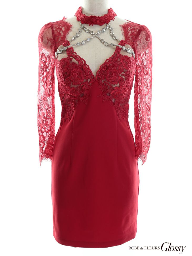 5. SALE [ROBEdeFLEURSGlossy/ローブドフルールグロッシー] 高級 レーススリーブ クロスビジュー バストカット チョーカー風 肩出し 二の腕カバー 袖あり 谷間魅せ タイトミニドレス