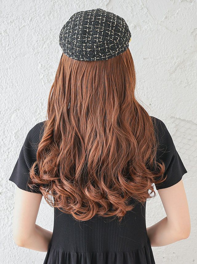 選べるストレート&カールロングヘアウィッグ付きラメツイードチェックチェーンキャスケットのカールイメージ画像3