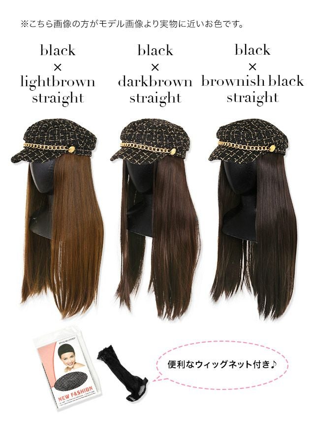 選べるストレート&カールロングヘアウィッグ付きラメツイードチェックチェーンキャスケットのストレートカラーバリエーション