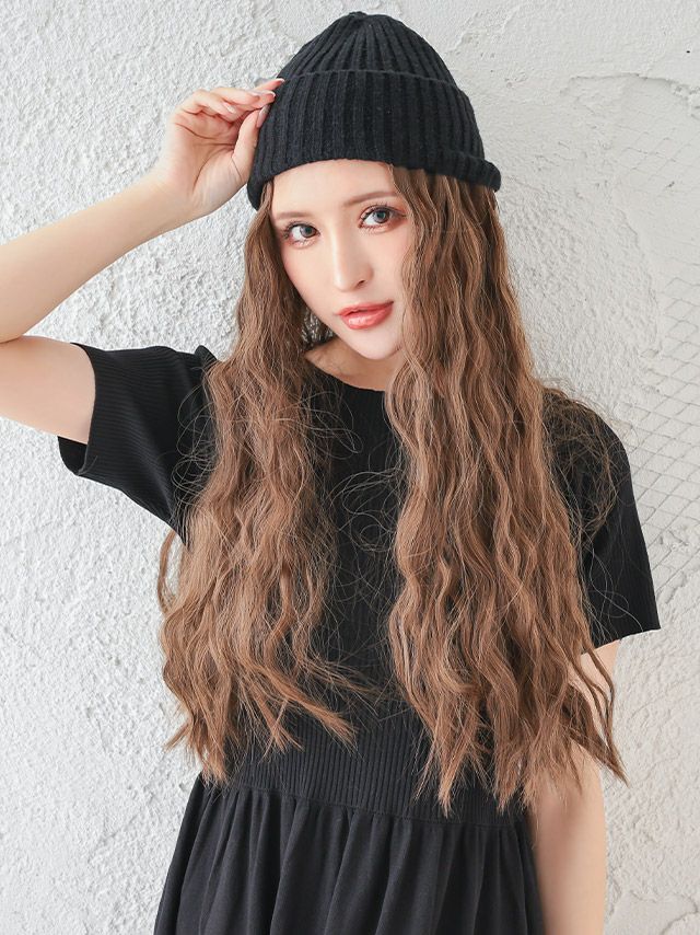 帽子を被るだけで簡単イメチェン叶う♪ ロングカールウィッグ付きニット帽子