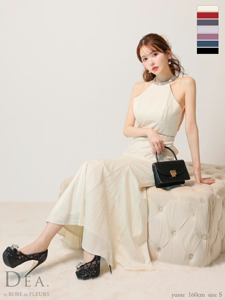 6. [DEA.byROBEdeFLEURS/ディアバイローブドフルール] 高級 ブランド ワンピース Aラインロングドレス 背中魅せ ホルターネック ウエストリボン ビジュー サテン (ゆんころ着用)