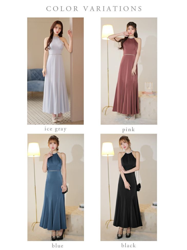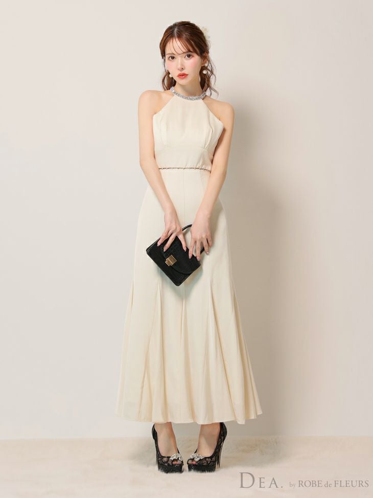 大胆なバックスタイルに視線釘付け♡ [DEA.byROBEdeFLEURS/ディアバイローブドフルール] 高級 ブランド ワンピース Aラインロングドレス 背中魅せ ホルターネック ウエストリボン ビジュー サテン (ゆんころ着用)