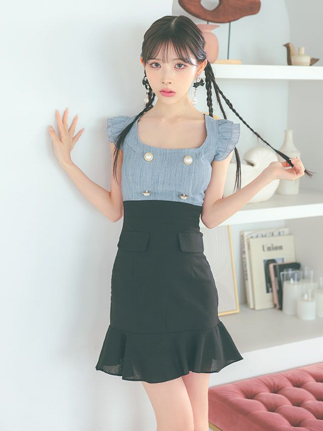 スクエアネックバイカラーパールボタンフリルマーメイドタイトミニドレスのカラーバリエーション