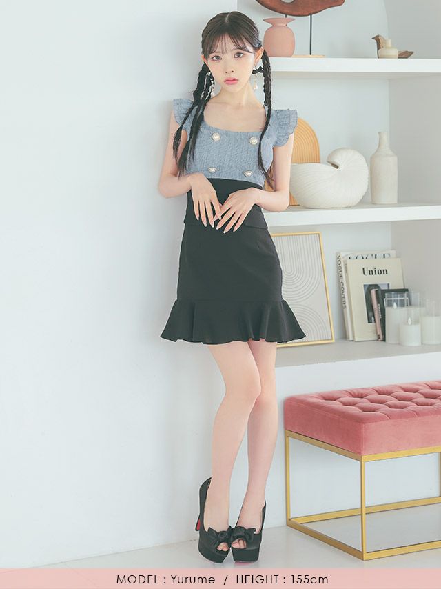 キャバドレス スクエアネック バイカラー パールボタン フリル マーメイド タイト ミニドレス