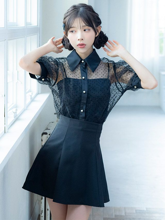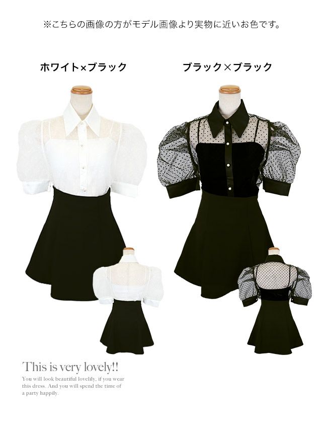 5. [ゲリラセール] [韓国ドレス] 襟付き 半袖 ドット柄 シアーシャツセットアップ フレアミニドレス (Sサイズ/Mサイズ) (緩苺/キャバドレス着用) [TikaPimil]