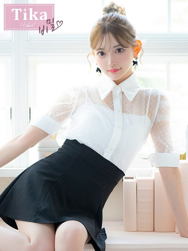 3. [ゲリラセール] [韓国ドレス] 襟付き 半袖 ドット柄 シアーシャツセットアップ フレアミニドレス (Sサイズ/Mサイズ) (緩苺/キャバドレス着用) [TikaPimil]