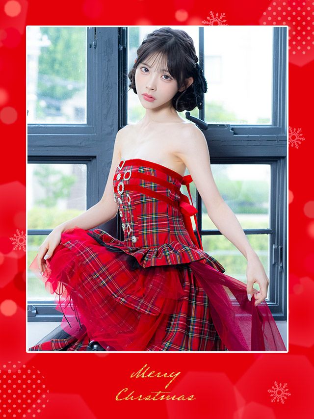 サンタコス 1点set ベロアバックリボンストーンビジューベアタータンチェックランダムフリルフレアスカートガーリーサンタコスプレドレスの商品詳細