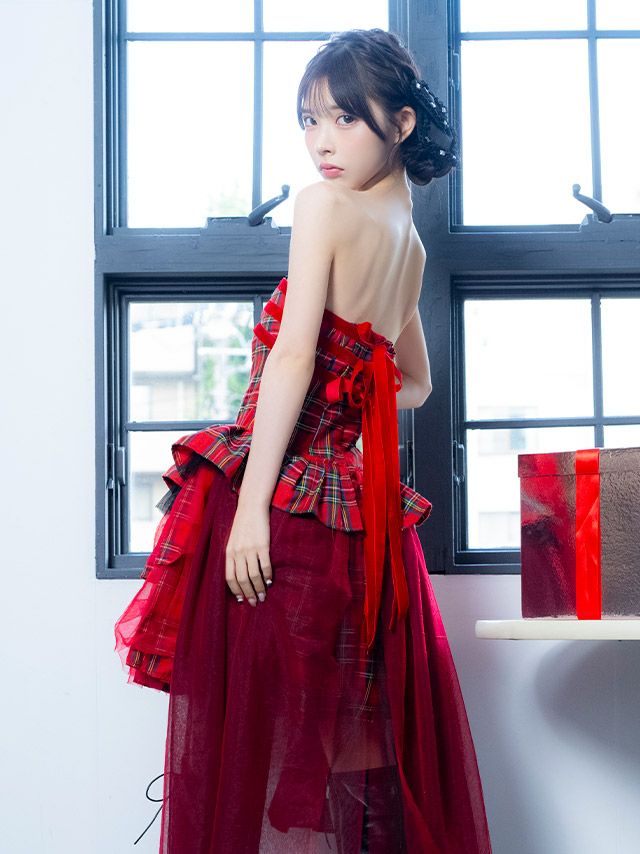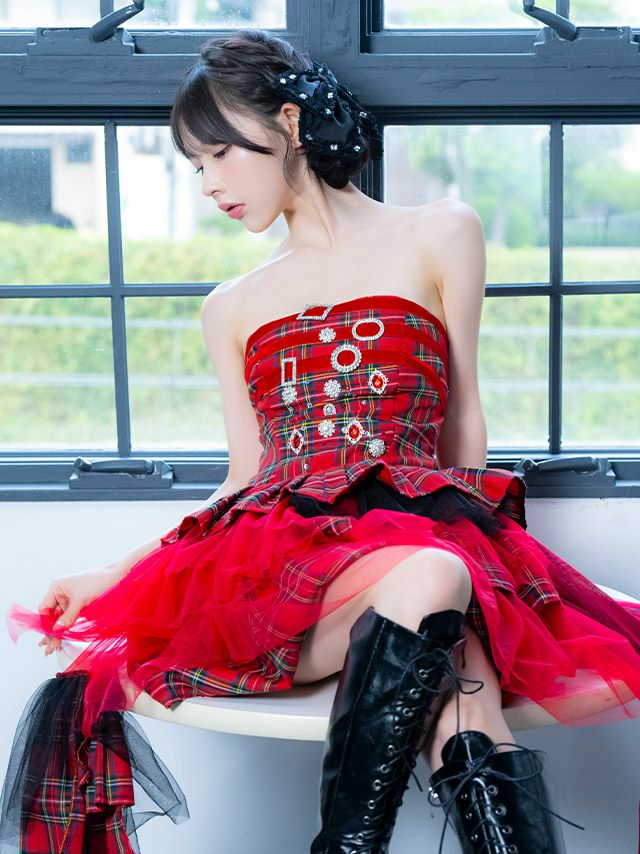 サンタコス 1点set ベロアバックリボンストーンビジューベアタータンチェックランダムフリルフレアスカートガーリーサンタコスプレドレスのイメージ画像5