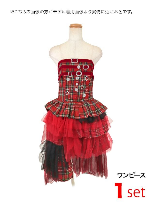 サンタコス 1点set ベロアバックリボンストーンビジューベアタータンチェックランダムフリルフレアスカートガーリーサンタコスプレドレスのセット内容