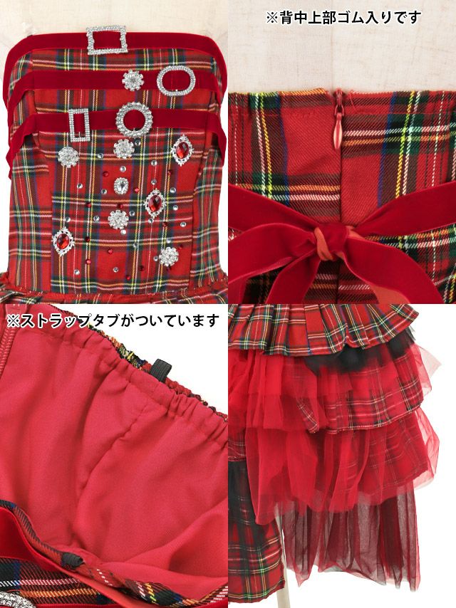 サンタコス 1点set ベロアバックリボンストーンビジューベアタータンチェックランダムフリルフレアスカートガーリーサンタコスプレドレスのイメージ画像2