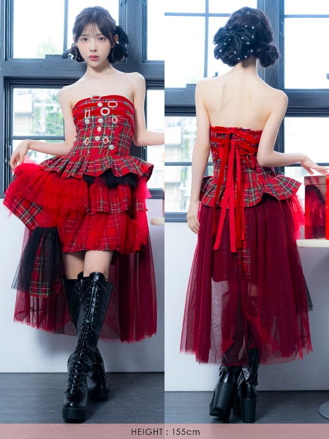 サンタコス 1点set ベロアバックリボンストーンビジューベアタータンチェックランダムフリルフレアスカートガーリーサンタコスプレドレスのイメージ画像1