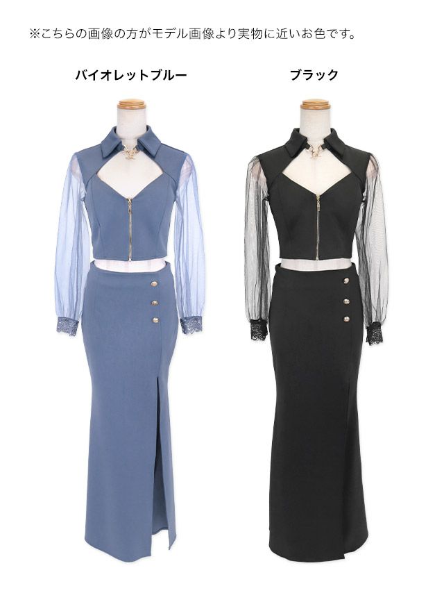 襟付き シアースリーブ 袖あり 長袖 バストカット ジップ 谷間見せ ワンカラー ストレッチ セットアップ スリット タイトロングドレスの商品特徴2