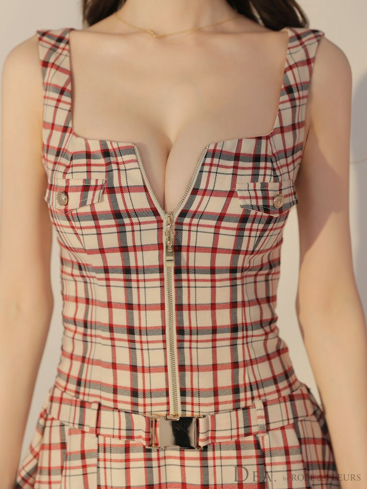 トレンド感溢れるガーリードレス☆ [DEA.byROBEdeFLEURS/ディアバイローブドフルール] 高級チェック柄ジップウエストベルトノースリーブフレアミニドレス