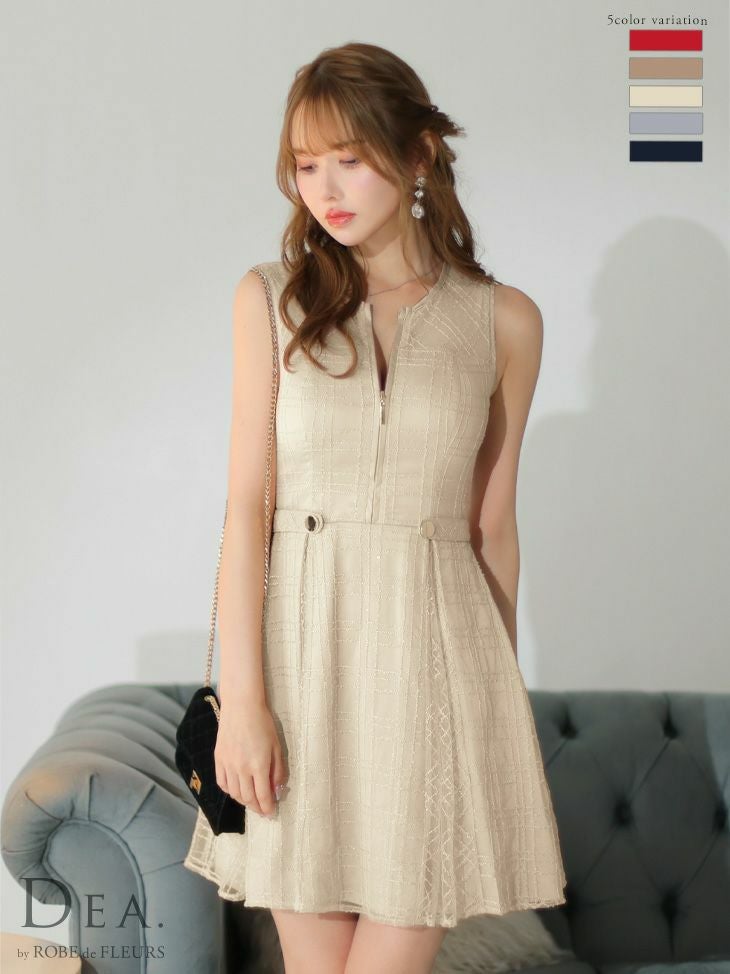 大人かわいいシンプルドレス☆ [DEA.byROBEdeFLEURS/ディアバイローブドフルール] 高級チェック柄ノースリーブバストジップチャック柄刺繍レースサイドベルト付きフレアミニドレス