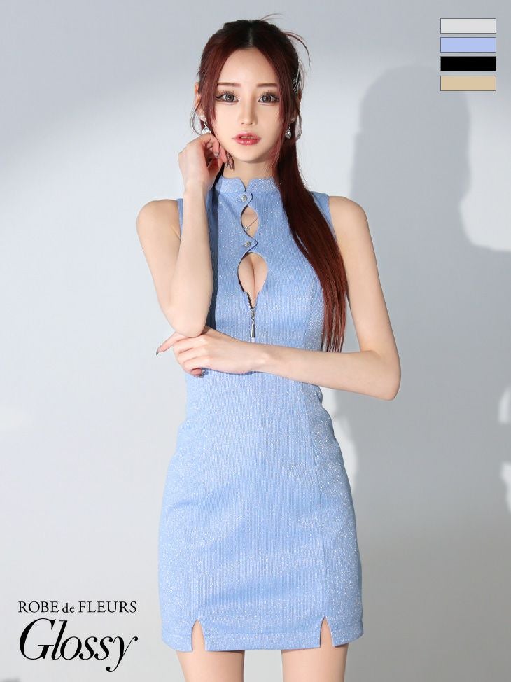 キャバドレス 小さいサイズ ROBEdeFLEURSGlossy/ローブドフルールグロッシー] 高級ノースリーブジップラメニットワンカラーストレッチボタンタイトミニドレス
