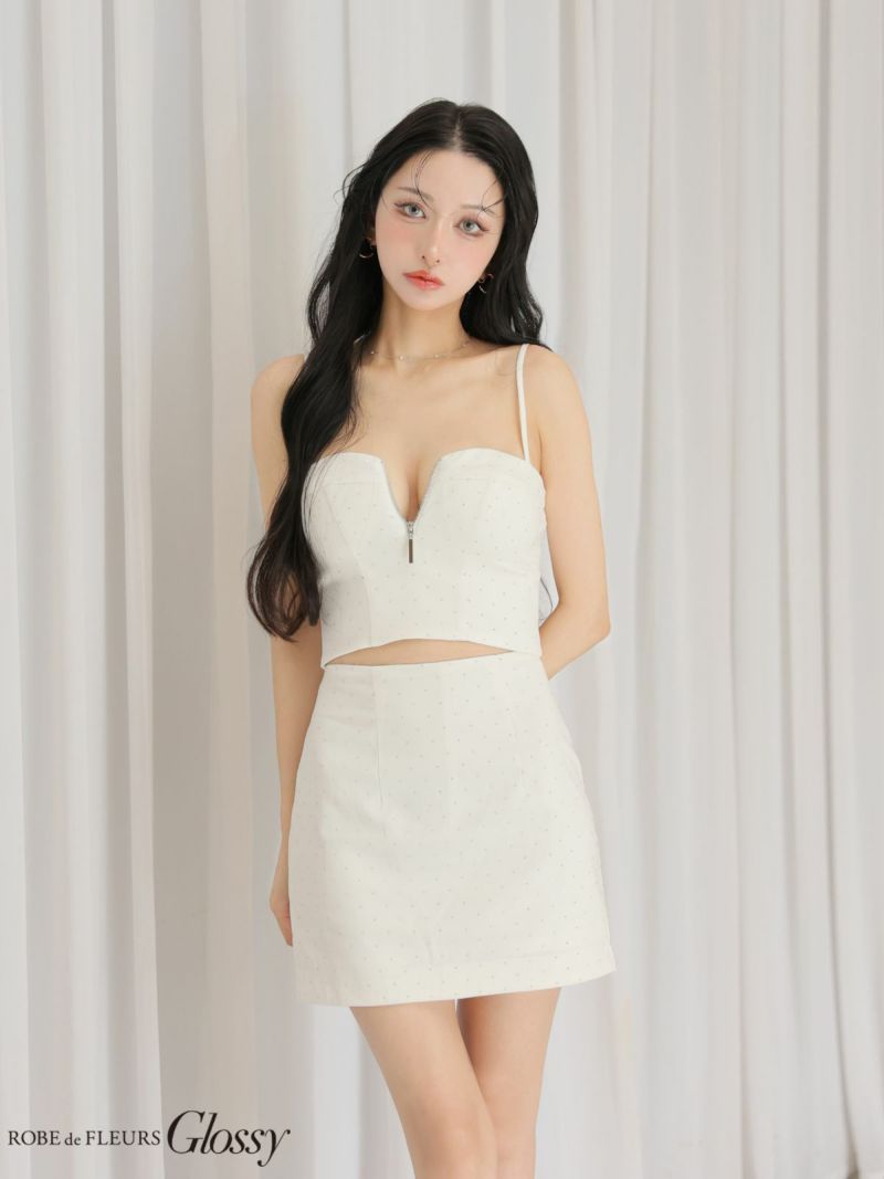 煌めくストーンが存在感をプラス♡ [ROBEdeFLEURSGlossy/ローブドフルールグロッシー] 高級 ブランド タイトミニドレス 谷間 キャミソール セットアップ ジップ ストーン ワンカラー