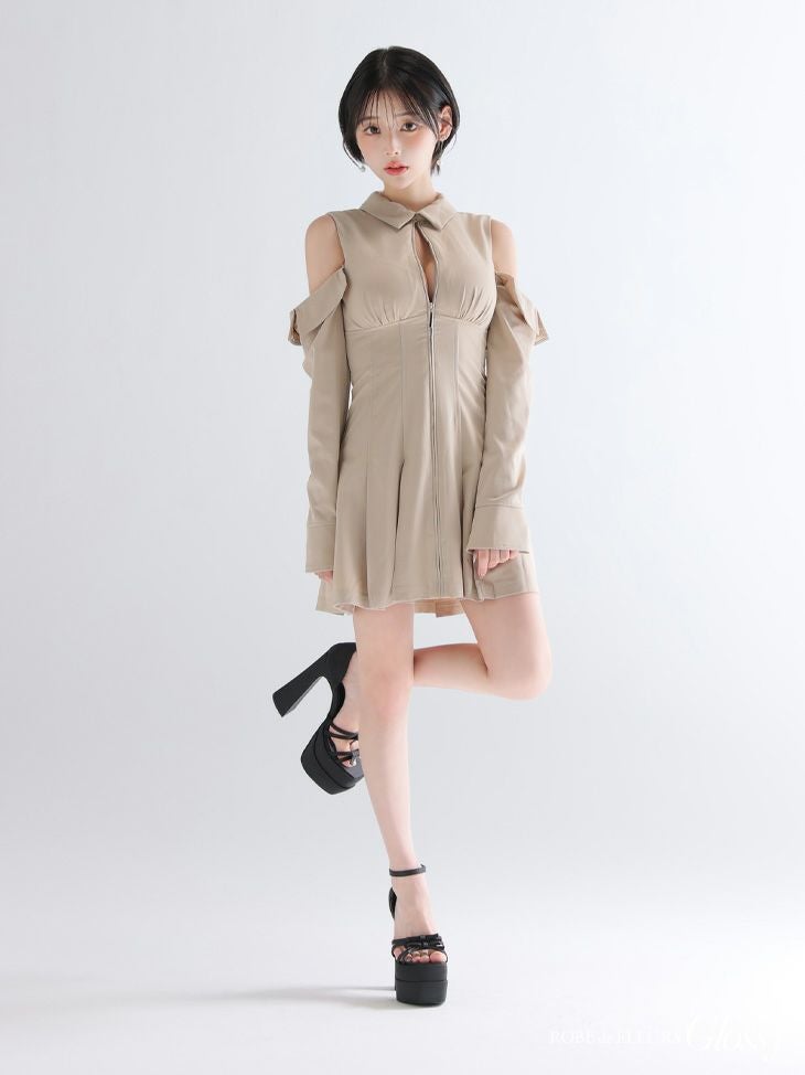4. [ROBEdeFLEURSGlossy/ローブドフルールグロッシー] 高級 ブランド Aラインミニドレス 長袖 袖あり 肩出し 襟付き ジップ プリーツ