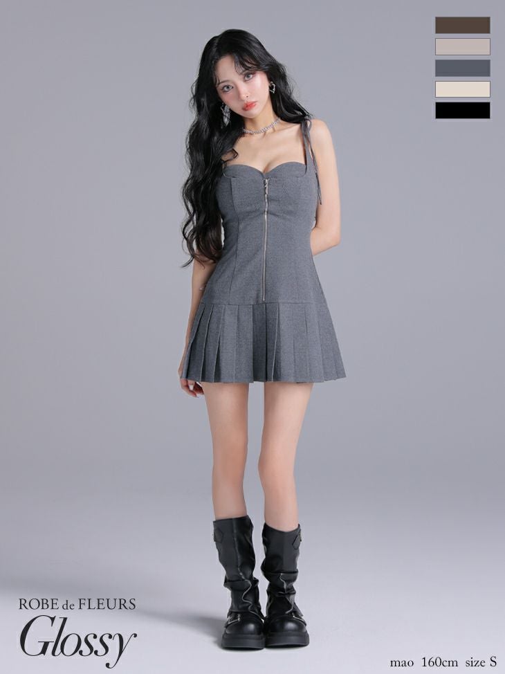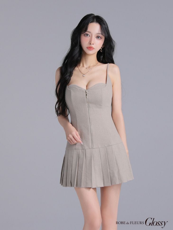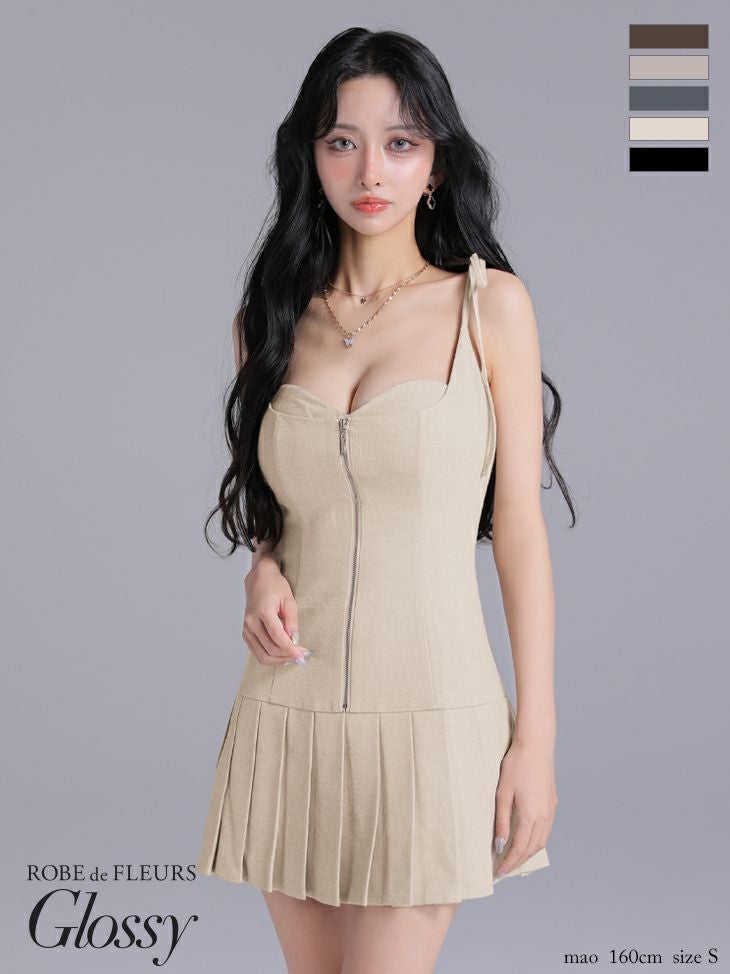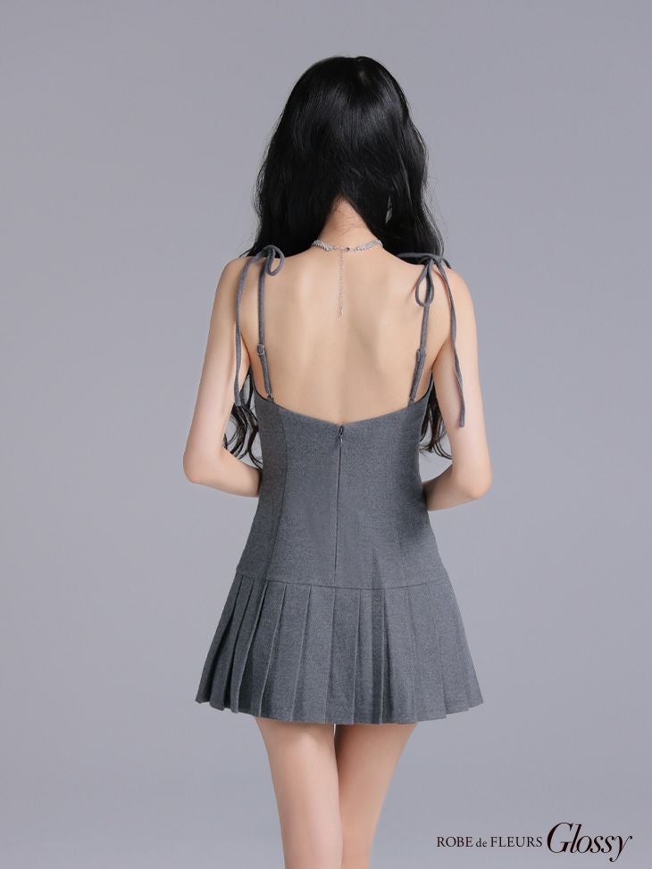5. [ROBEdeFLEURSGlossy/ローブドフルールグロッシー] 高級 ブランド Aラインミニドレス キャミソール 背中魅せ ジップ ショルダーリボン プリーツ