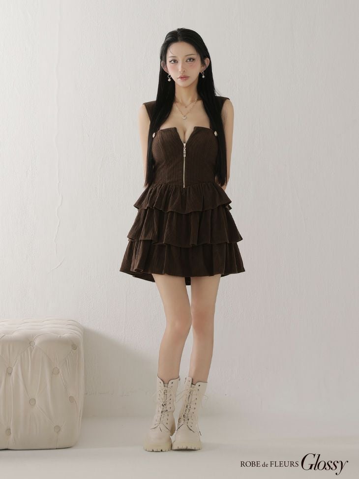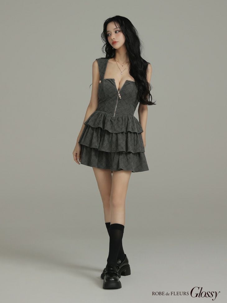 4. [ROBEdeFLEURSGlossy/ローブドフルールグロッシー] 高級 ブランド Aラインミニドレス ノースリーブ 谷間 チェック柄 ジップ 2way ベアデザイン フーディー ティアードフリル