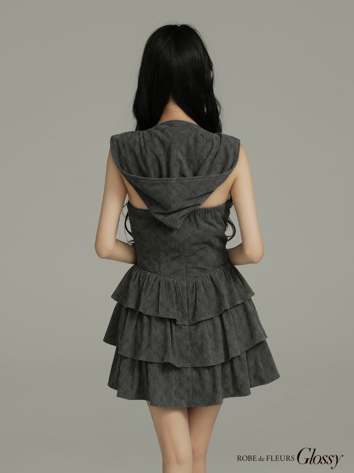 周囲と差をつけるフード付きデザイン♡ [ROBEdeFLEURSGlossy/ローブドフルールグロッシー] 高級 ブランド Aラインミニドレス ノースリーブ 谷間 チェック柄 ジップ 2way ベアデザイン フーディー ティアードフリル