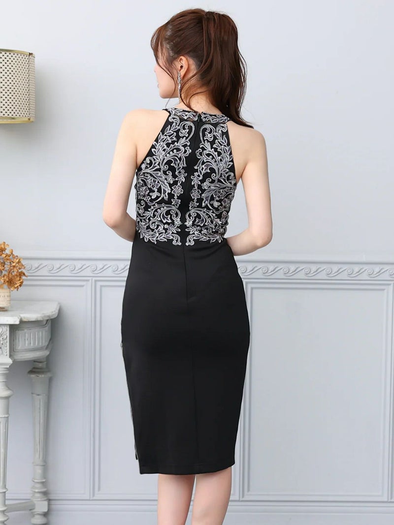 4. [Veautt/ヴュート] 高級 ホルターネック ジップ 刺繍デザイン バストカット ビジュー 谷間魅せ ファスナースリット タイト 膝丈ドレス