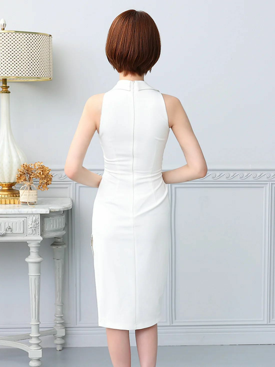 他の画像を見る 襟付きデザインで大人の魅力を引き出す☆ [Veautt/ヴュート] 高級 ノースリーブ 襟付き ボタン 谷間魅せ ファスナースリット タイト 膝丈ドレス ¥ 29,480 税込 お気に入りに追加