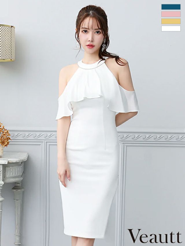 他の画像を見る サイドジップで美脚アピール☆ [Veautt/ヴュート] 高級 肩出し 二の腕カバー ホルターネック ワンカラー ファスナースリット タイト 膝丈ドレス ¥ 29,480 税込 お気に入りに追加