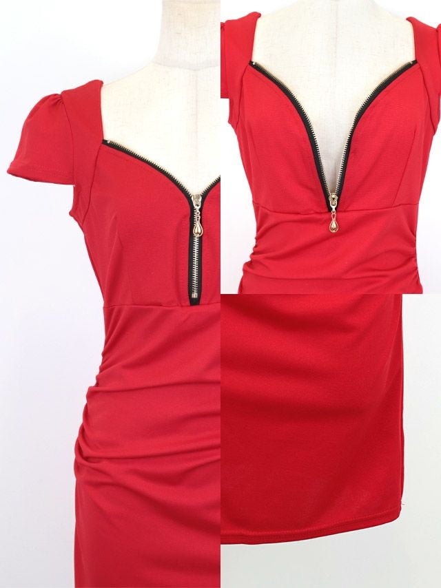 えちえちな1着♪ 安い タイトミニドレス 谷間 シンプル 大人 上品 ストレッチ 半袖 ジップ パフスリーブ ブラジャーのまま プチプラ (ちぴたん れいたぴ着用)